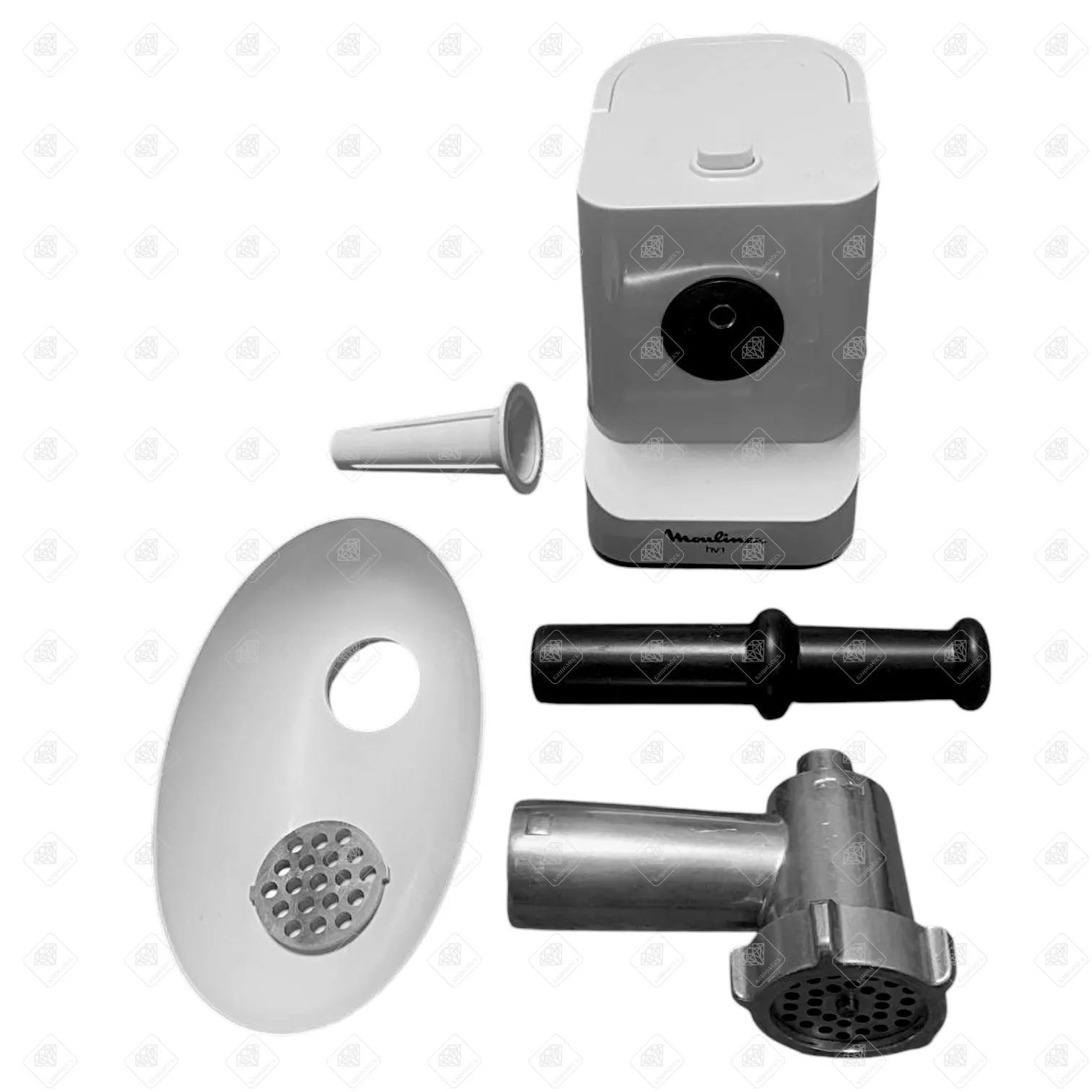 2 сменные насадки,1 решетка, толкатель для мясорубки, насадка для сосисок, крышка