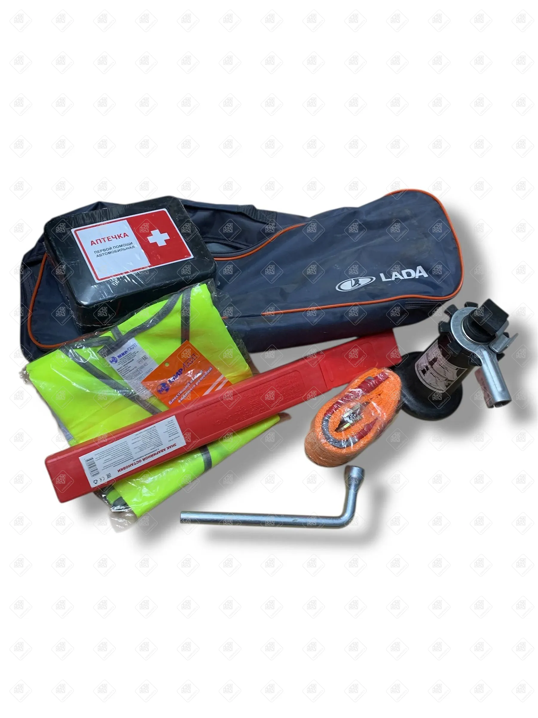 Сумка для инструментов: изготовлена из грязе- и влагоотталкивающей ткани с фирменным логотипом LADA. Знаки аварийной остановки: соответствуют ГОСТ Р 41.27. Аптечка первой помощи: соответствует действующим требованиям безопасности Минздрава РФ. Лента для тросов: изготовлена из прочной полиэфирной нити. Огнетушитель порошковый: ОП-2. Буксировочный трос: с пружинным фиксатором крюков и специальным способом крепежа для плавного движения автомобиля при буксировке.*Товар, бывший в употреблении. Можно приобрести с доставкой по всей России