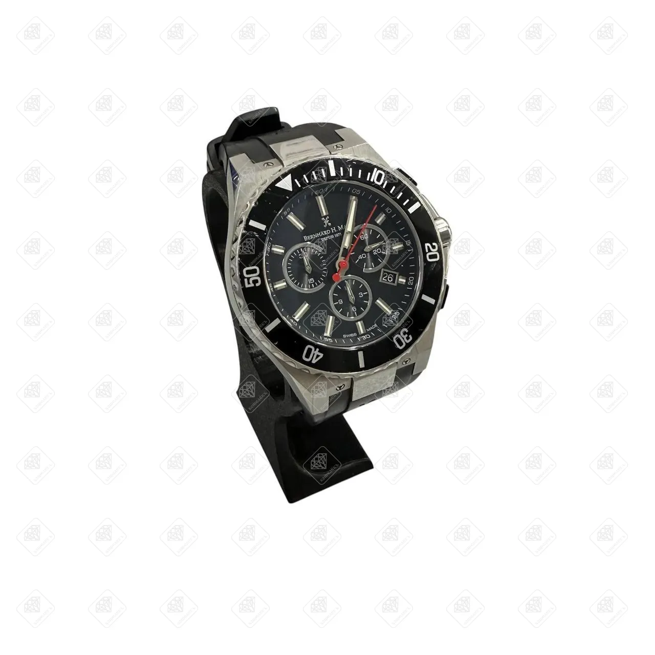 Пряжка из черной резины и нержавеющей стали 316L Материал: Матовая/полированная нержавеющая сталь 316L с черным поворотным безелем Диаметр: 44 мм Механизм: Швейцарский кварц - RONDA Стекло: Устойчивое к царапинам сапфировое стекло с антибликовым покрытием Функции: Час, минута, хронограф и дата Водонепроницаемость: 10 ATM (100 метров/330 футов)*Товар, бывший в употреблении. Можно приобрести с доставкой по всей России