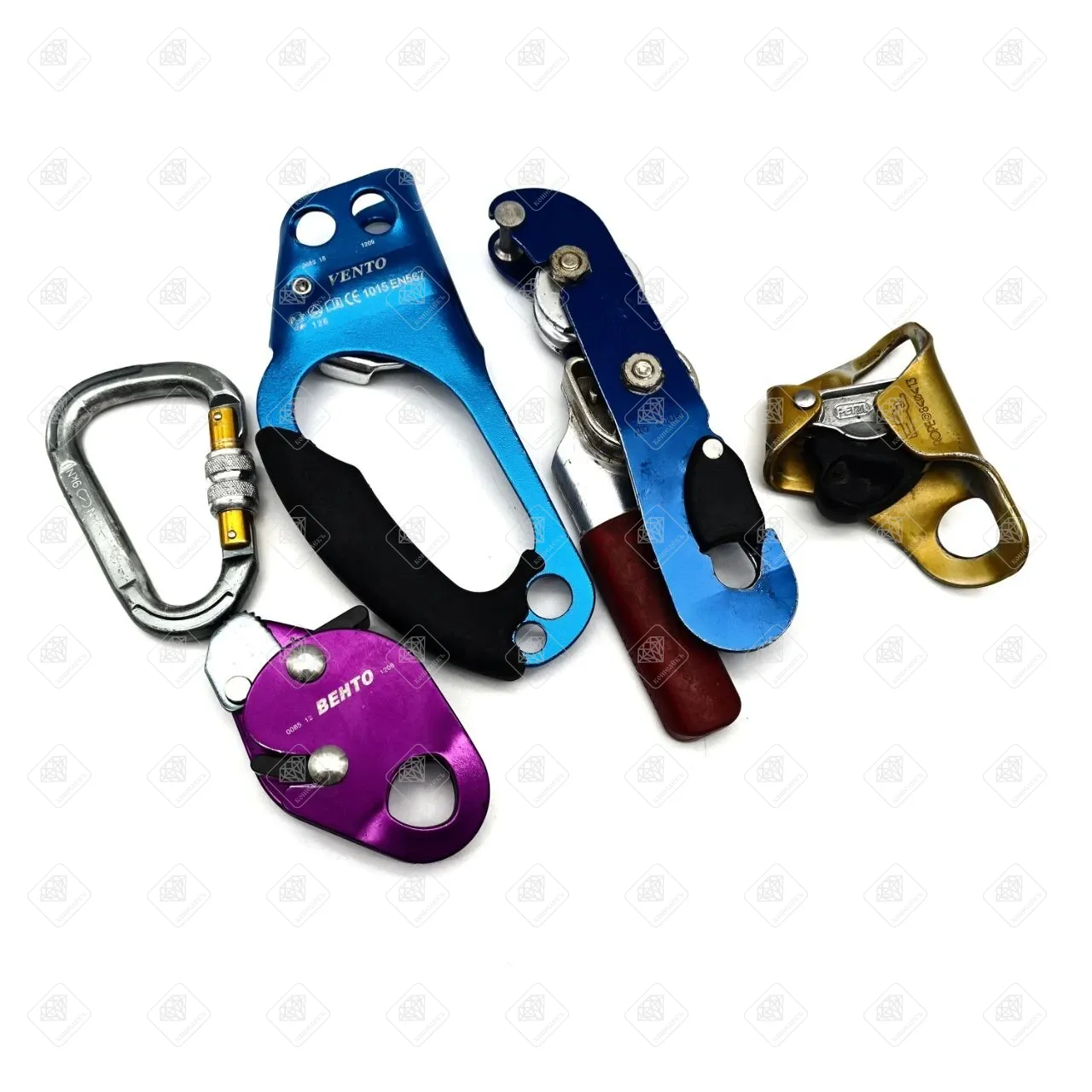 1 Behto зажим веревочный капля, 2 Зажим ручной под правую руку "Жумар", 3 Карабин Венто "Стальной универсальный, 4 Спусковое устройство Vento Стопор-Десантер 5 блок - ролик behto*Товар, бывший в употреблении. Можно приобрести с доставкой по всей России